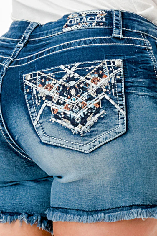Grace in LA Ladies Aztec Mid Rise Denim Shorts - EH61590