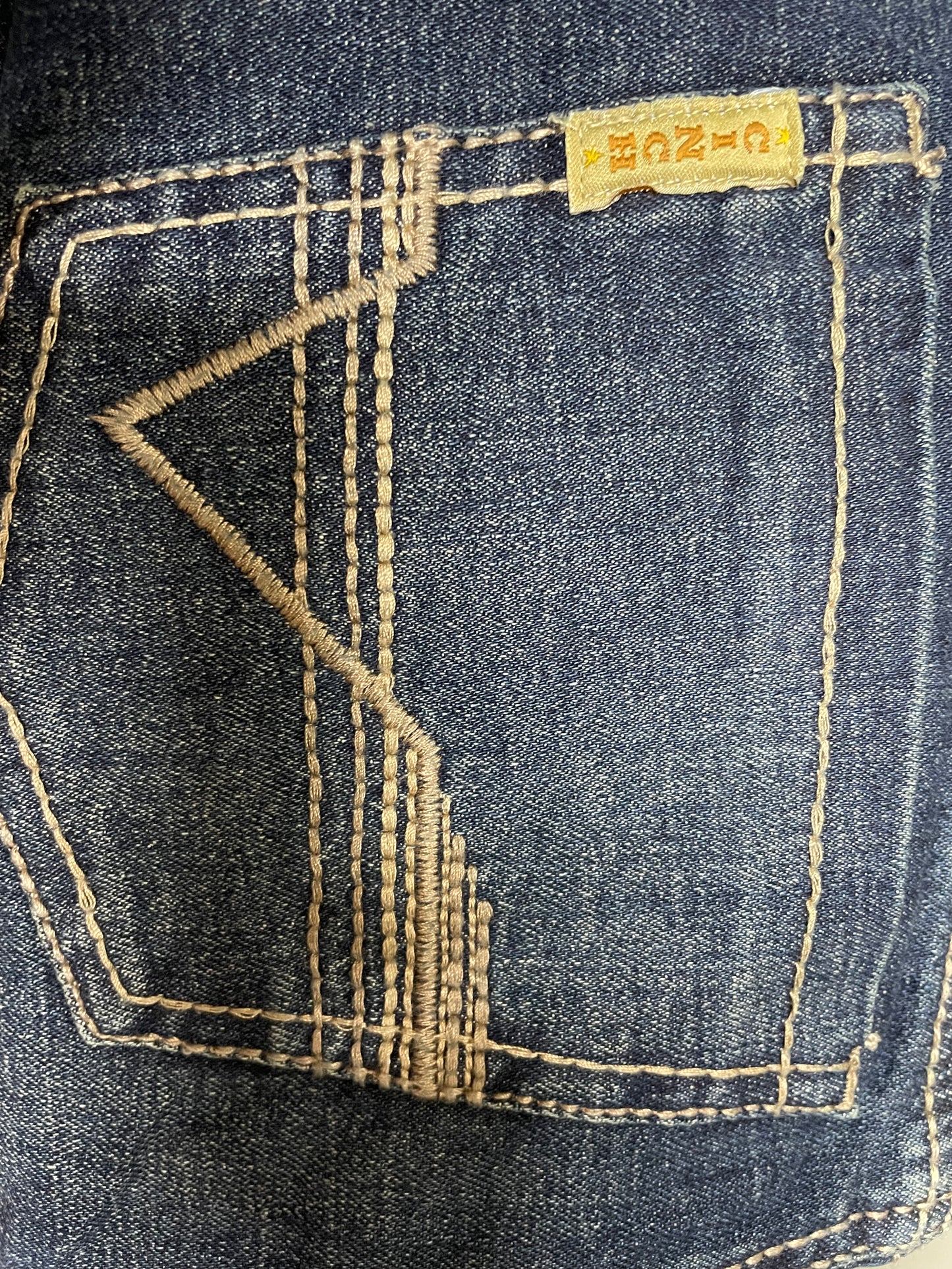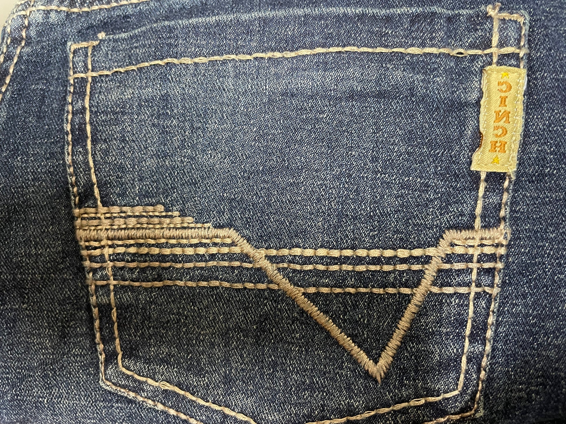 classic rinse finish complimented by tint, hand sanding, whiskers and chevrons. Cream and amber embroidered back pockets, along with copper hardware
