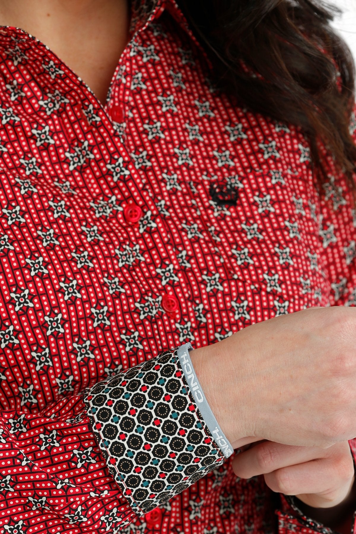 Go bold red wearing this head-turning printed cotton plain weave by CINCH that features contrast trim, logo embroidery and red buttons.