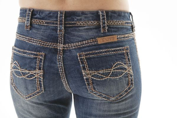 Cowgirl Tuff Ladies Jeans - Mix It Up. Featuring brown and white stitching on pockets and down side seam of legs.