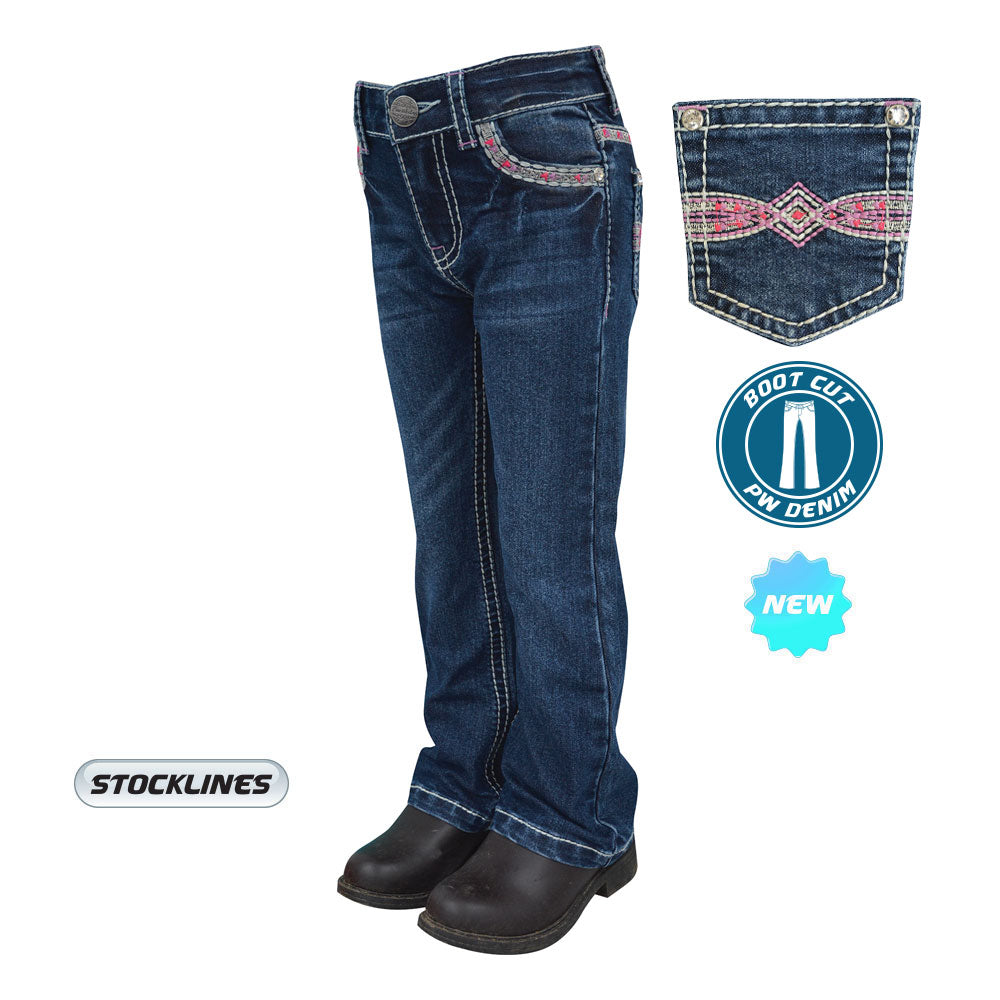 Features: Stretch for comfort, adjustable elastic waistband on all sizes, logo shank button, mock leather logo badge on back waistband, feature back pocket, yoke and front scoop pocket embroidery, diamanté rivets