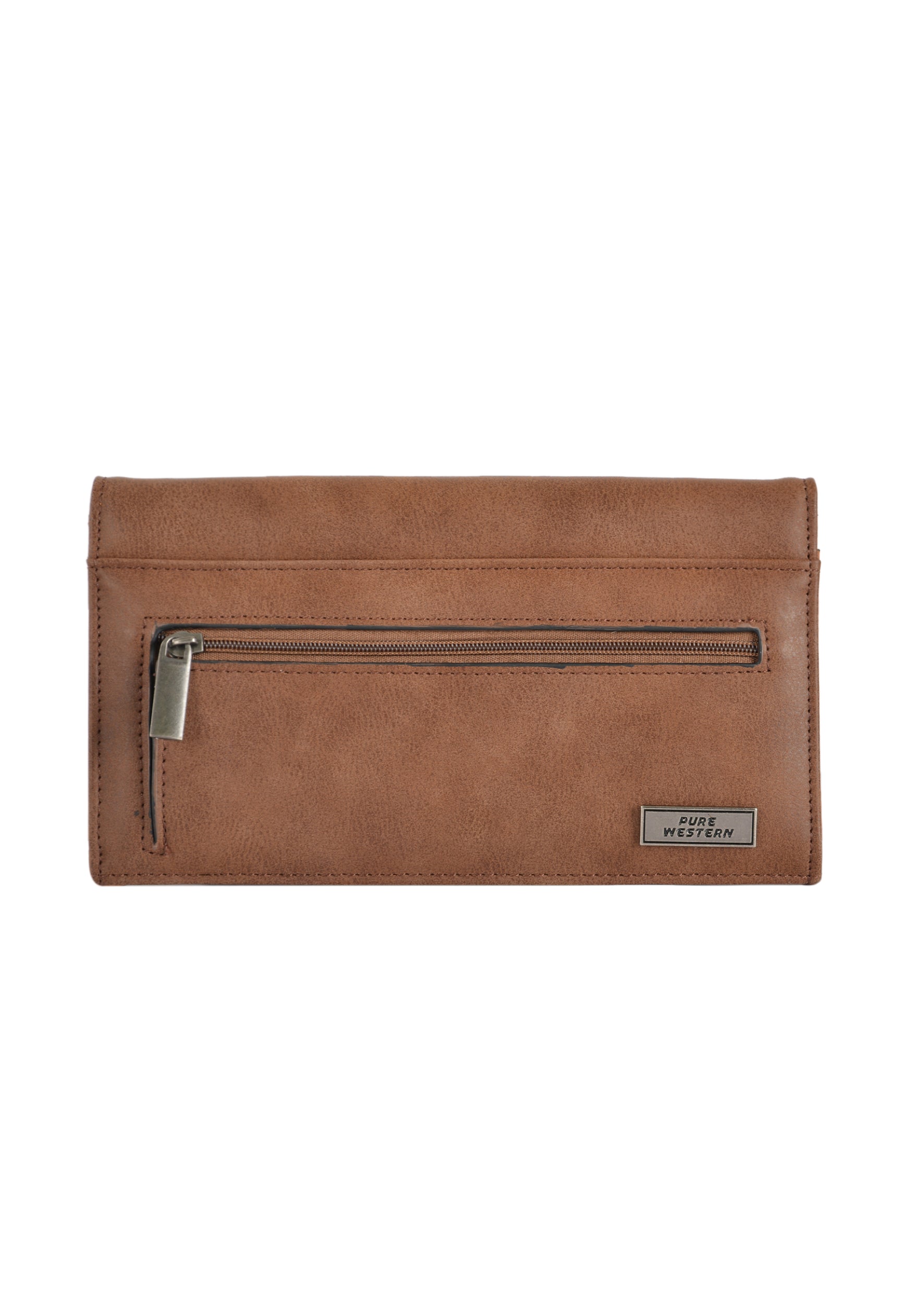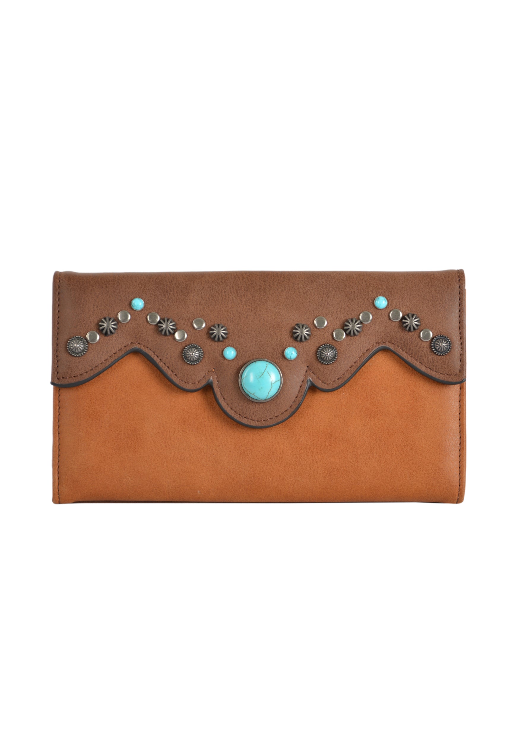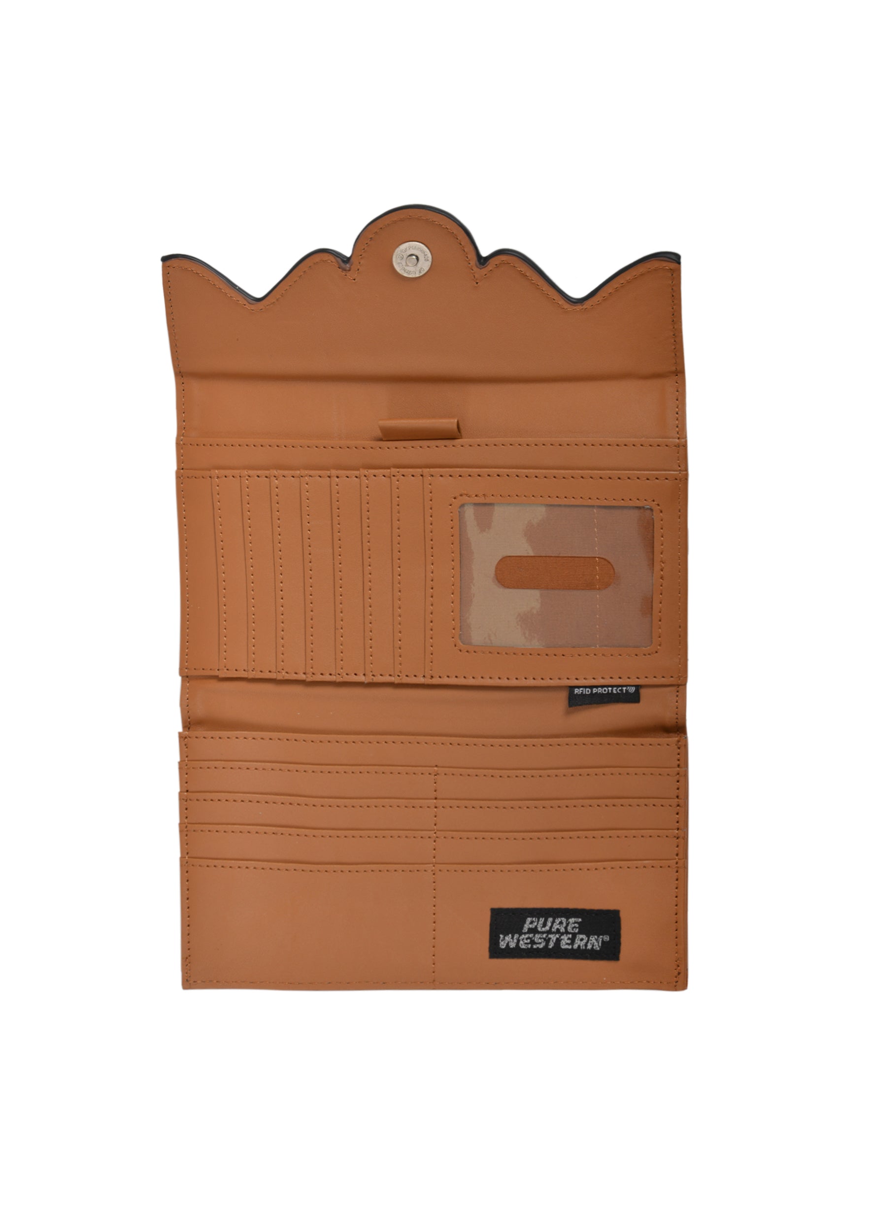 Features: Cutaway two-tone design, multi stud and concho pattern, fold out wallet with snap closure, back zip pocket, internal zip coin pocket, 16 x card slots and 1 x ID slot, 2 x note pockets, RFID PROTECT Technology protects your credit cards from fraud and identity theft. H 11cm x W 19cm x D 2cm