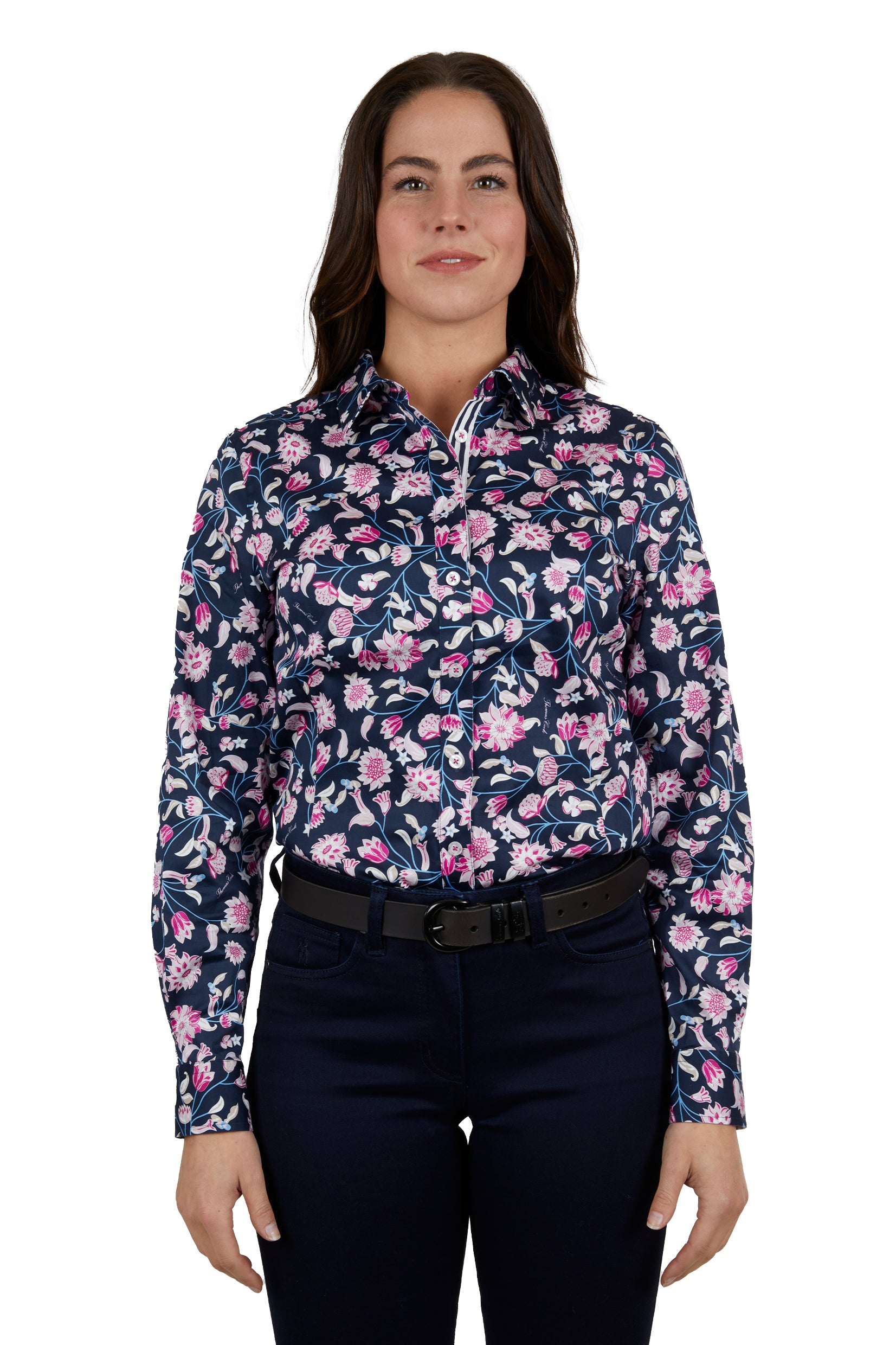 Thomas Cook original hand drawn print, stretch for comfort and movement, velvet taping on inside neck and sleeve cuffs, front and back waist darts, pintuck detail at sleeve cuffs, criss cross embroidery on cuff pintucks, removable collar stays, horseman embroidery on side hem.