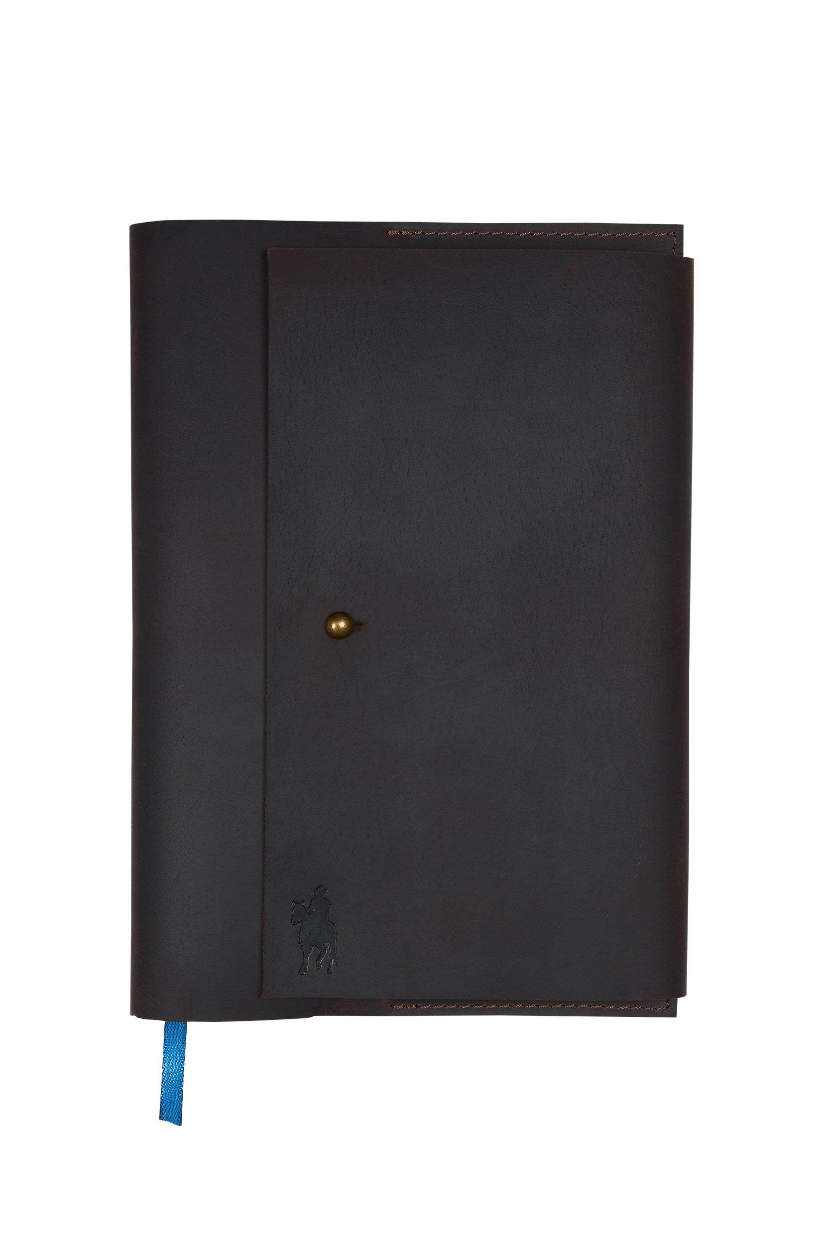 Leather external cover, embossed logo on front and back, fits A5 notebook or diary, lined A5 notebook is included.