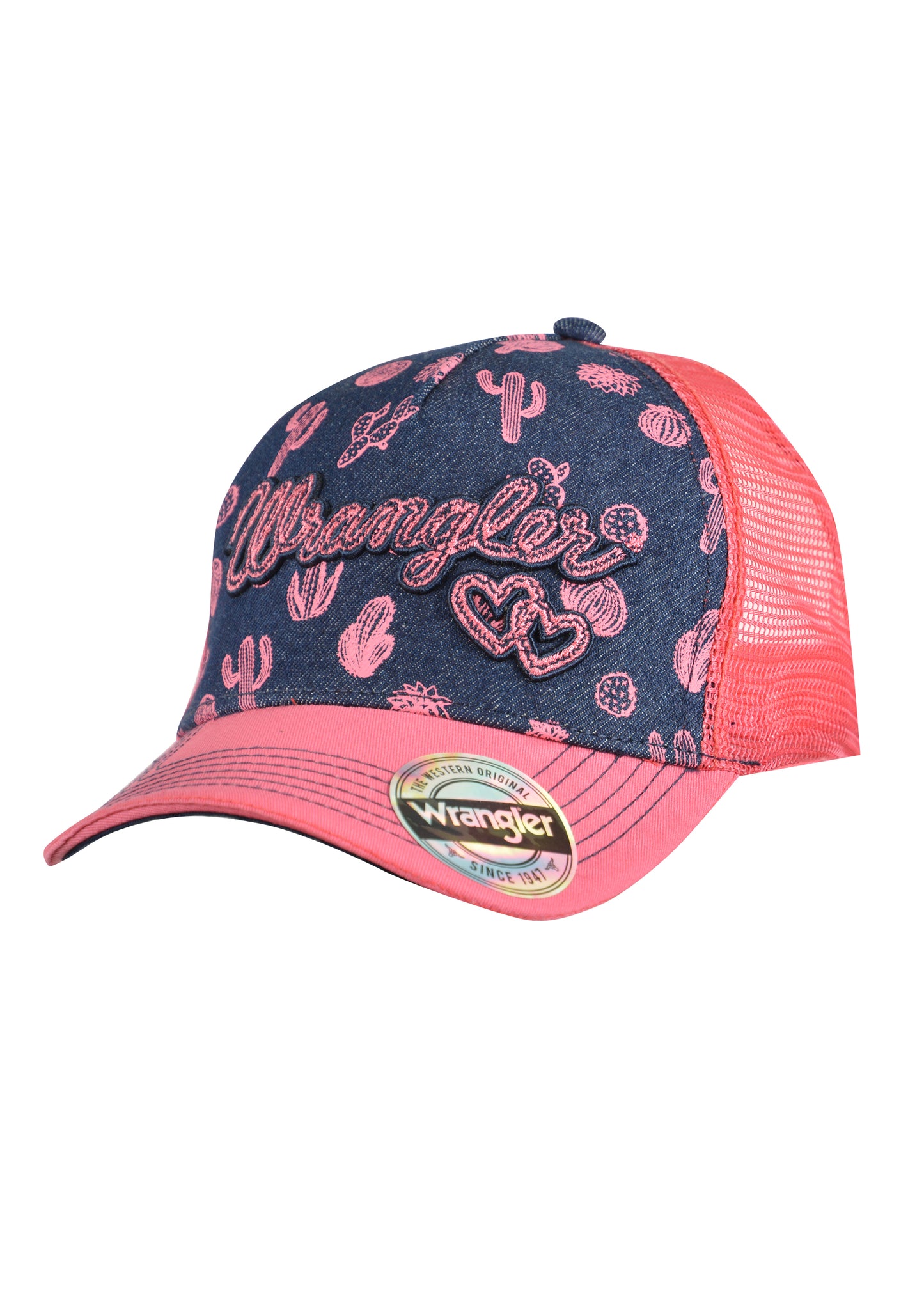 5 panel trucker cap, front embroidered Wrangler® with original hand drawn heart detail, contrast peak with contrast stitching, back embroidery.